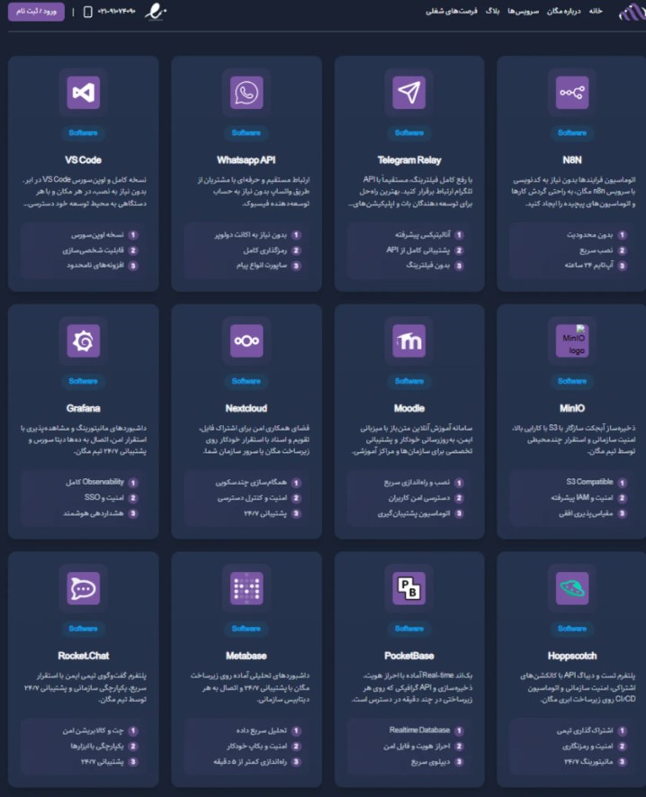 در بخش محصولات مگان، سرویس نرمافراری مانند Whatsapp API, N8N, Telegram Relay, Vs Code, Next Cloude, Meta Base و بسیاری موارد کارآمد دیگر وجود دارد.